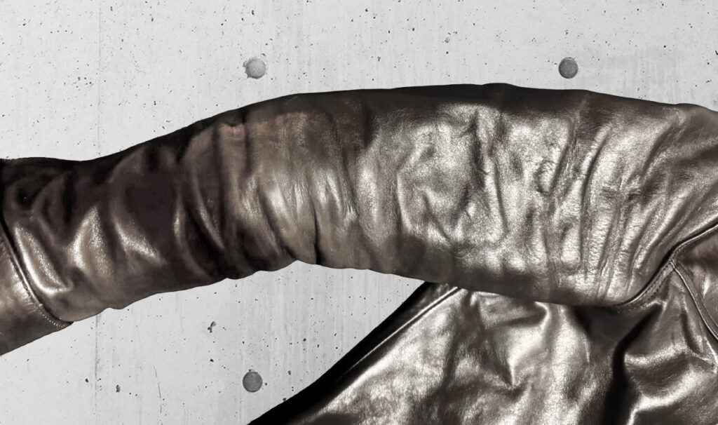 腕には厚みと硬さのある革を曲げた時に発生する、大きな蛇腹状のシワができています。